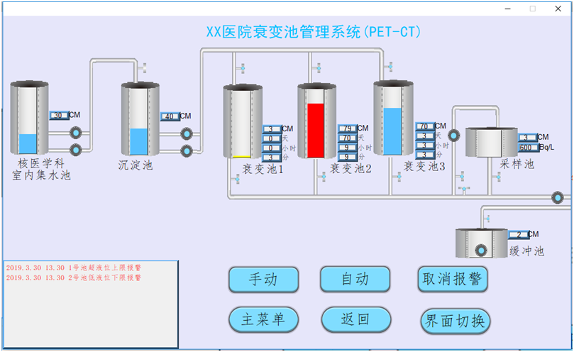 放射性废液衰变池管理系统由自动控制系统,自动取样测量系统和不锈钢存放罐体构成,自动控制系统实现罐体废液的自动贮存及排放,自动取样测量系统实现对存放一定时间的废液进行放射性活度测量,判断是否达到排放活度要求。通过采用该系统,可以实现远程智能化管理放射性废液的贮存,排放操作。保障废液排放前,严格达到监管单位的排放标准。